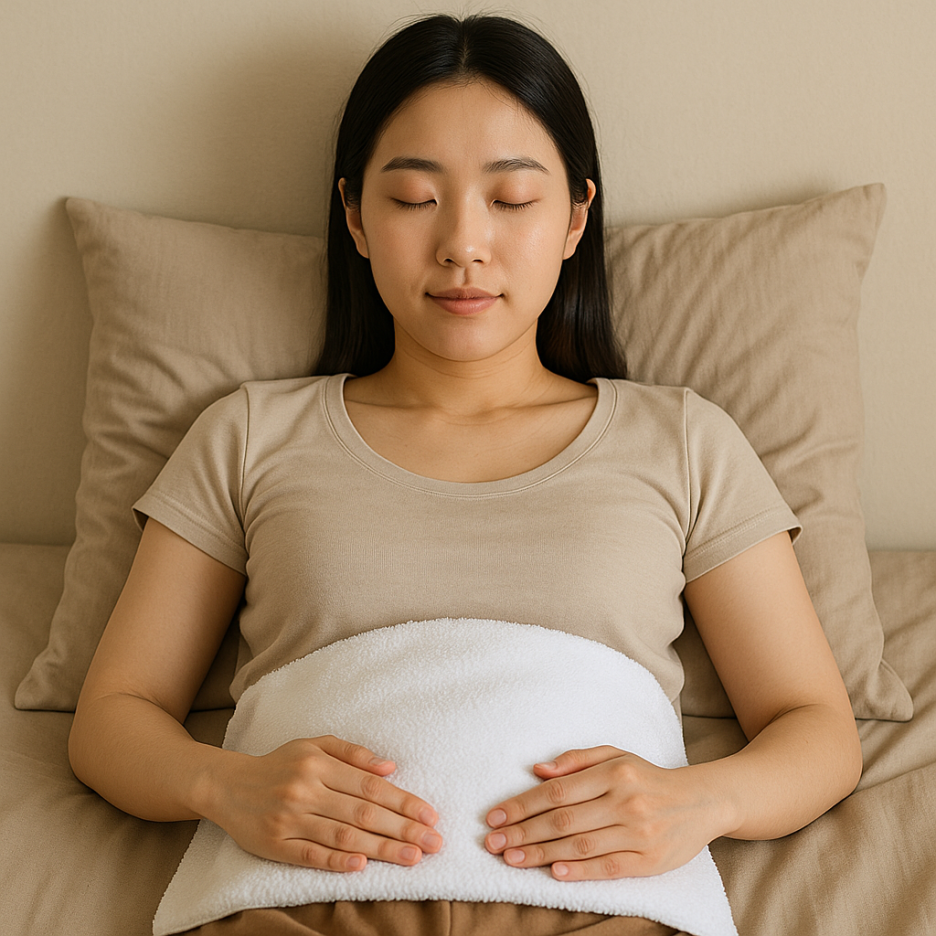 따뜻한 물주머니나 수건을 복부에 대어주면 혈액순환이 개선되어 통증 완화에 효과적입니다.