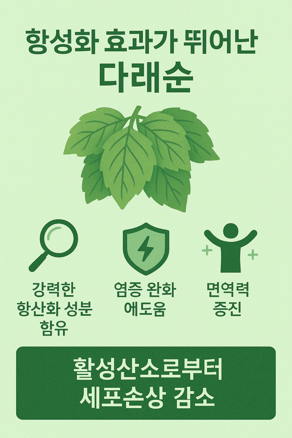 다래순에는 폴리페놀, 플라보노이드와 같은 항산화 성분이 다량 함유되어 있습니다.