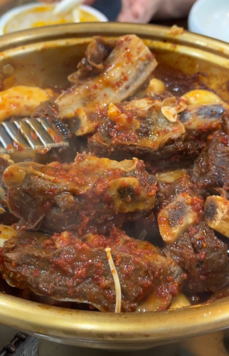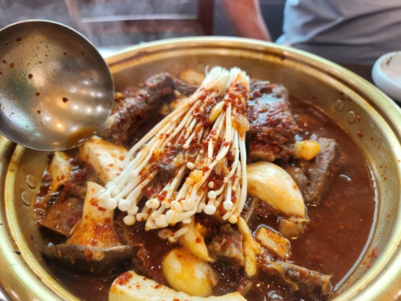 달큰하면서도 은근히 맵고, 감칠맛 나는 양념에 잘 졸여진 갈비가 부드럽게 씹히면서도 쫄깃하고,