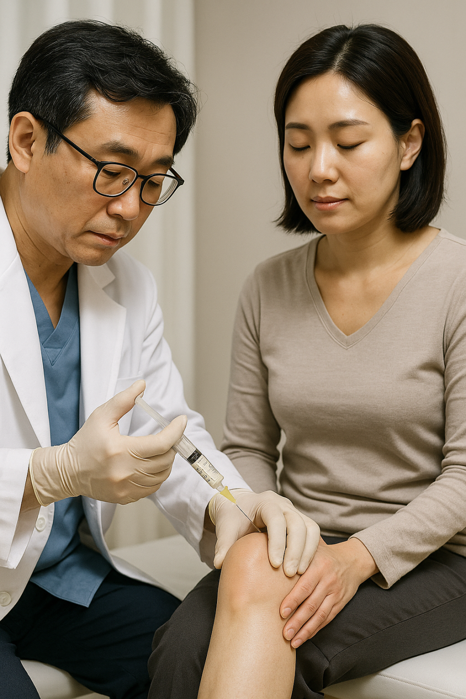 관절에 가득 찬 물을 주사기로 빼내어 통증과 부기를 완화합니다.