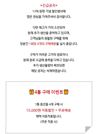 4통 구매 시 15,000원 자동 할인 + 무료배송 혜택을 제공합니다.