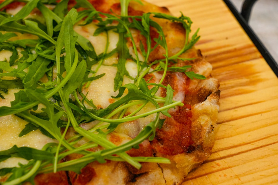 최상급 이탈리아 카푸토 밀가루와 신선한 루꼴라, 수제 토마토 소스로 완성된 로마식 피자.