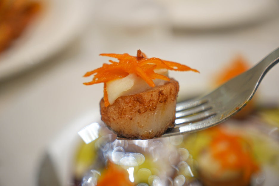 레드와인 소스와 감자 퓌레, 오렌지필이 어우러진 고급스러운 가리비 관자 구이.