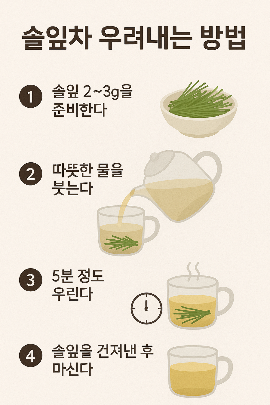 - 우려내기: 뜨거운 물에 솔잎을 담가 약 5~10분간 우려낸 후 마셔도 됩니다.