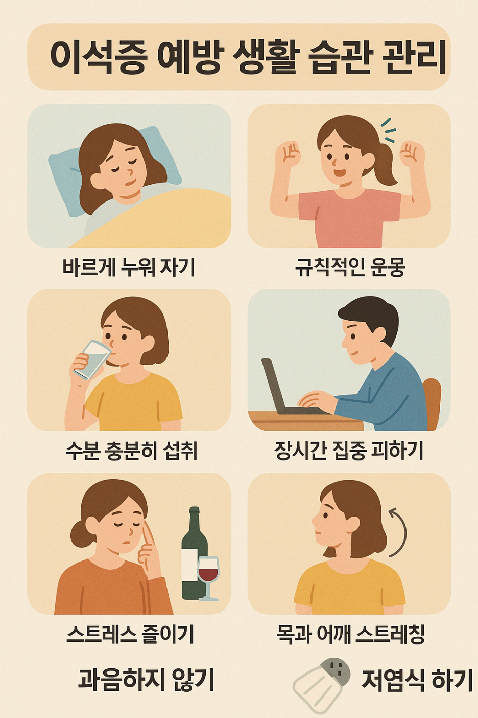 - 규칙적 스트레칭 및 목·어깨 근육 이완