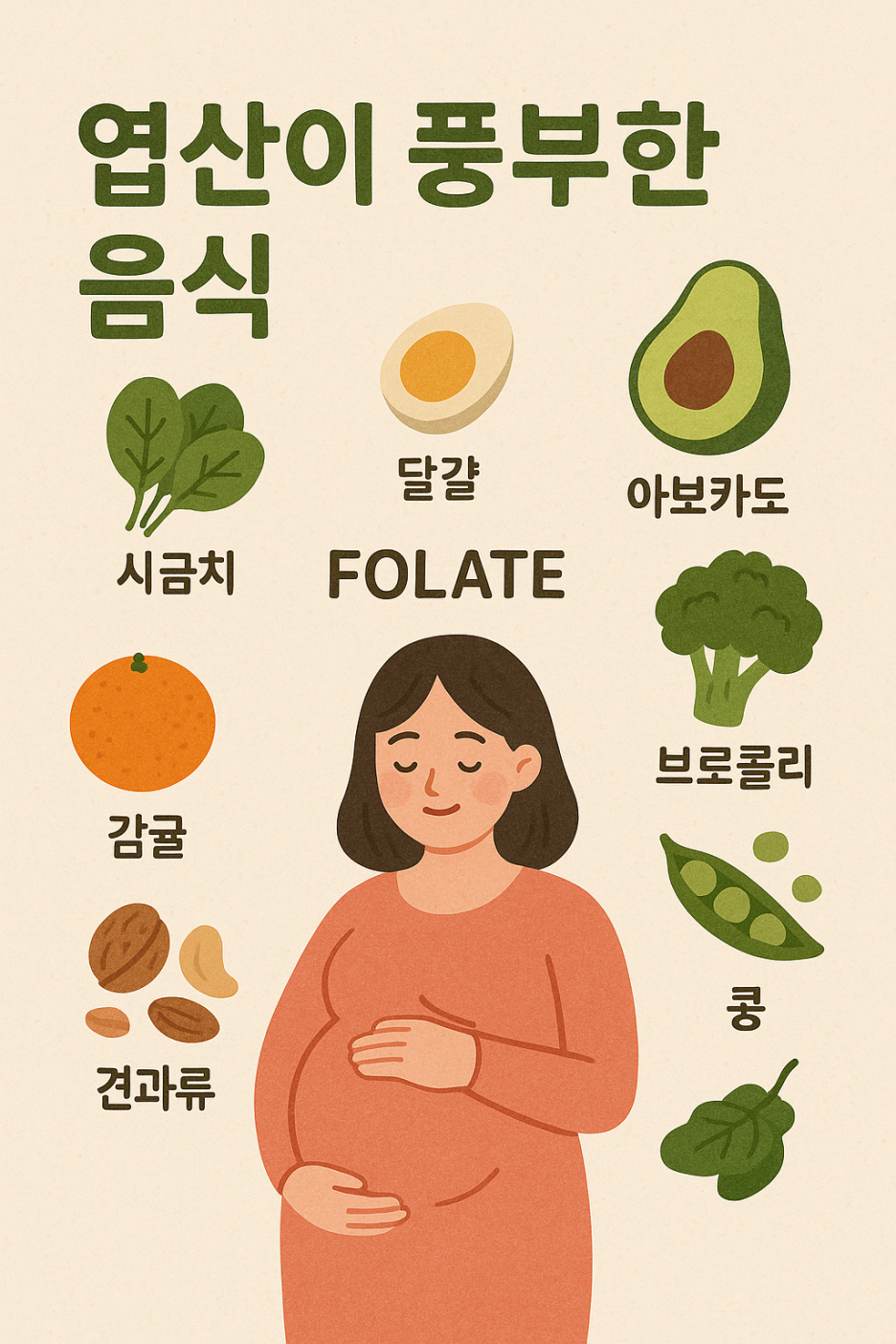 시금치, 브로콜리, 아스파라거스, 콩류, 귤·오렌지 같은 과일에 엽산 풍부