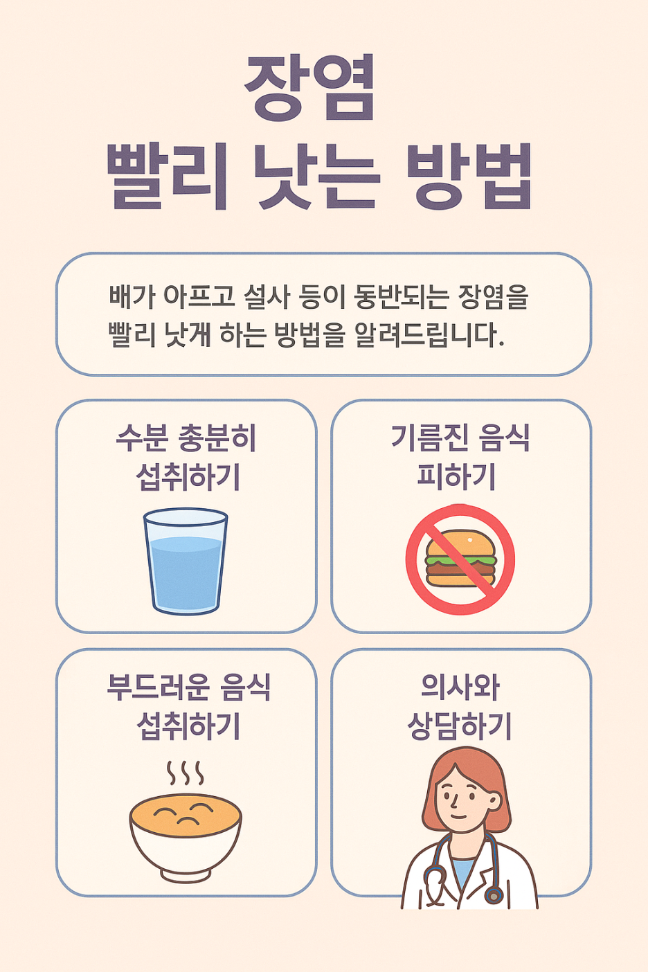 장염은 적절한 초기 관리와 휴식만 잘 해도 대부분 3~5일 이내에 자연 회복될 수 있습니다.