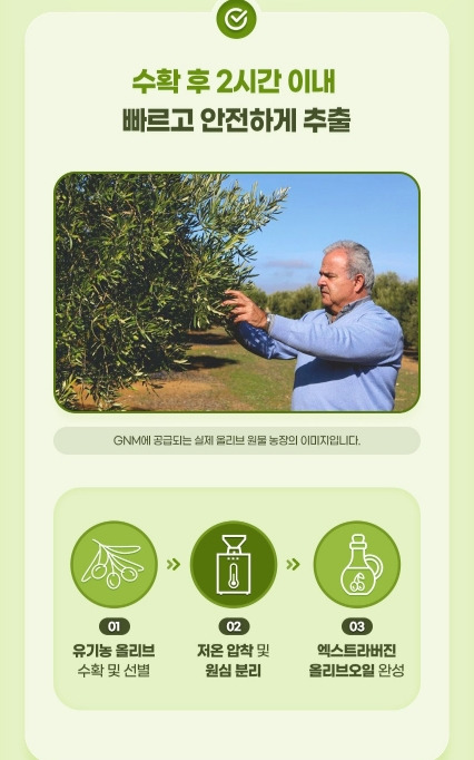 GNM 올리브오일은 수확 후 2시간 이내에 빠르게 압착해 신선도를 지켜냅니다.