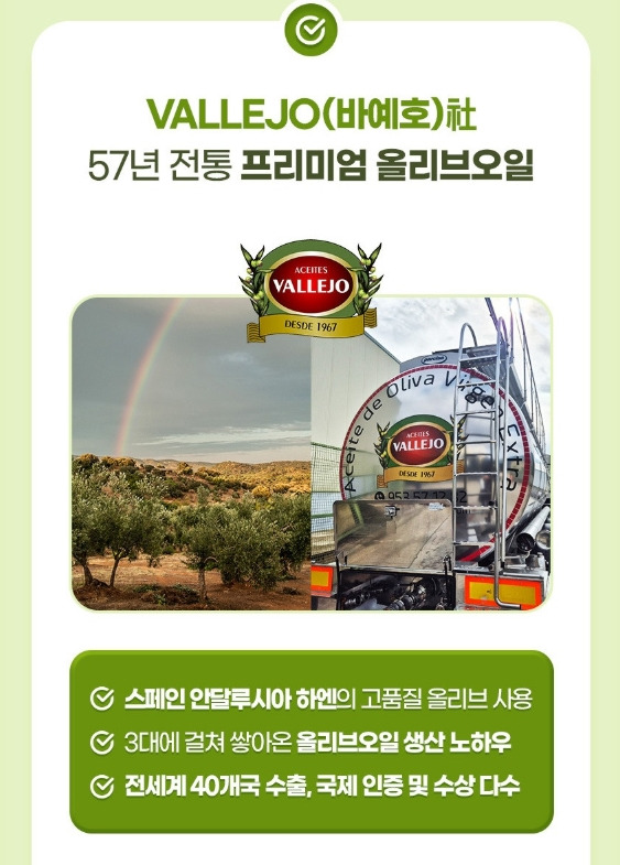 GNM이 선택한 원료는 VALLEJO(바예호) 사의 57년 전통 프리미엄 올리브오일입니다.