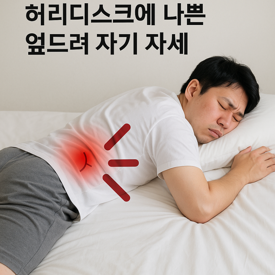 엎드려 자는 자세는 척추를 뒤로 과도하게 젖히게 되어 허리디스크에 가장 안 좋은 자세 중 하나입니다.