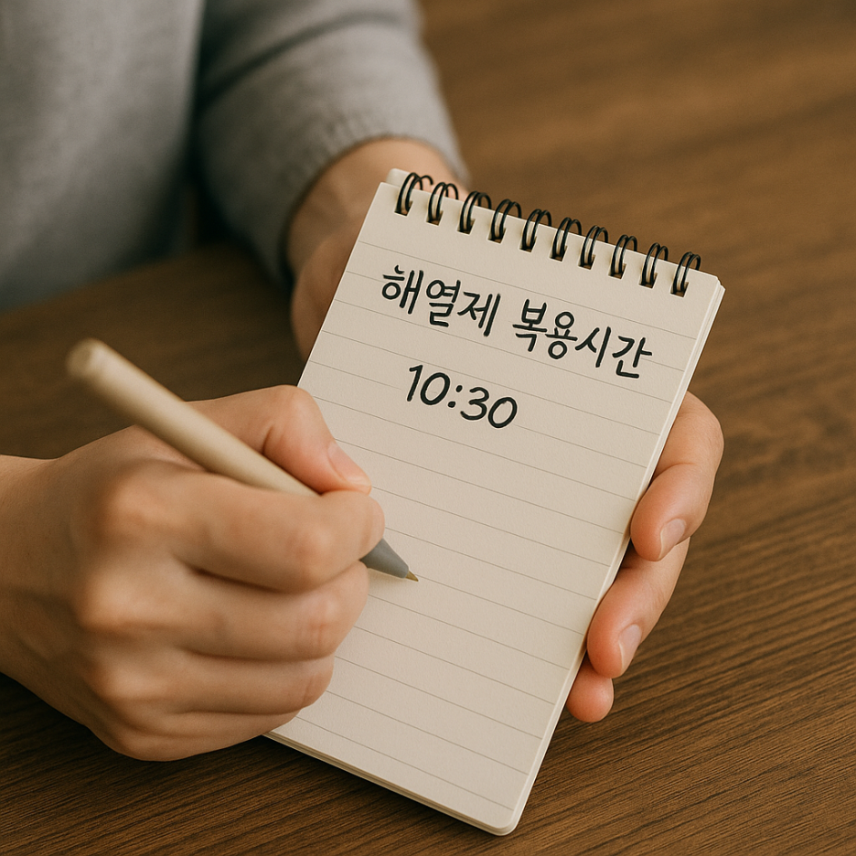 복용시간, 약 이름, 용량을 표로 기록하여 혼동을 막으세요.