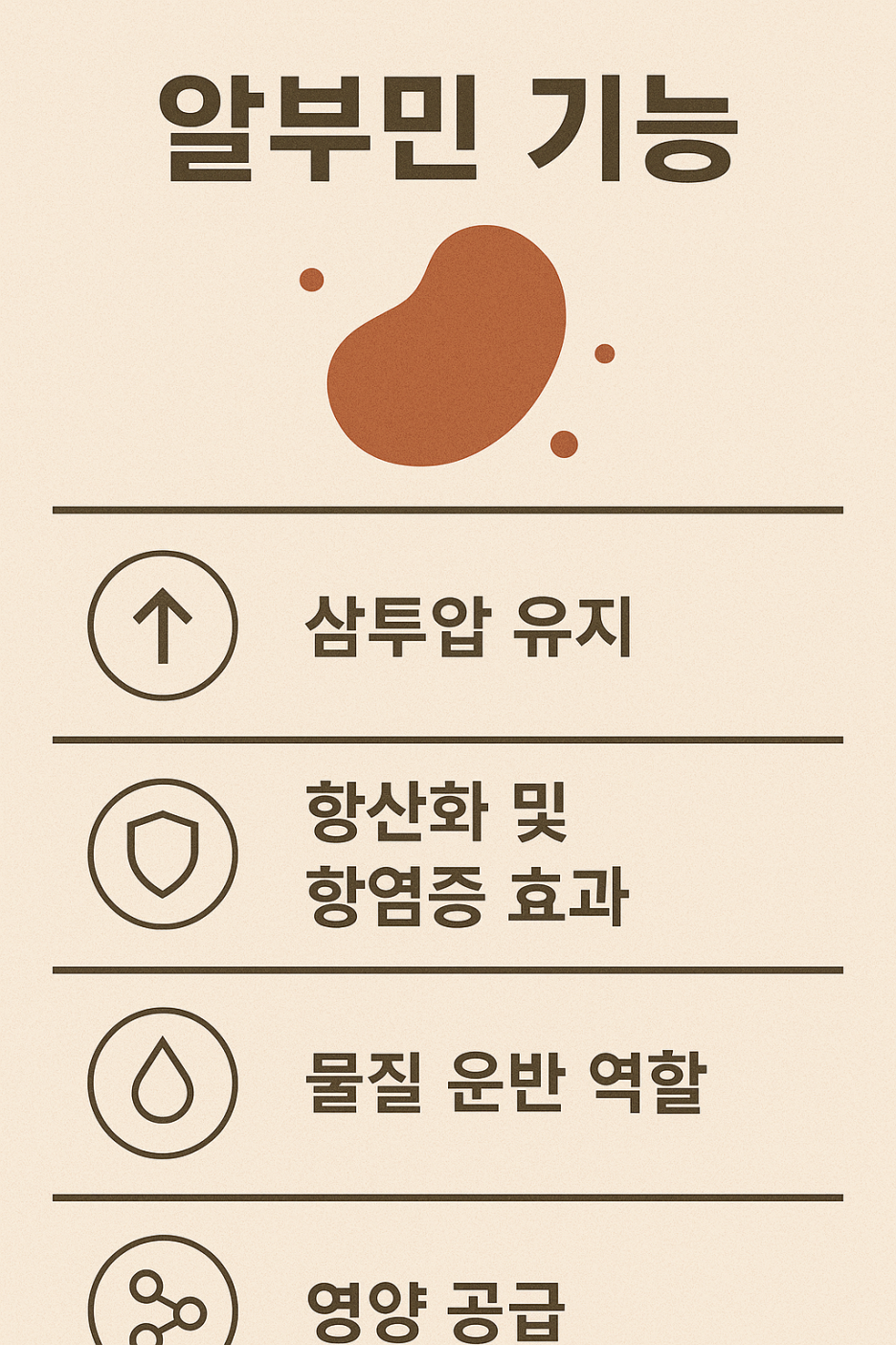 알부민은 혈관 내 삼투압을 유지해 체내 수분이 혈관 밖으로 빠져나가지 않도록 도와줍니다.