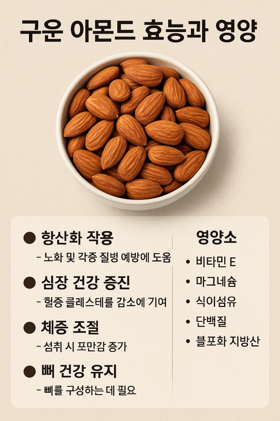 구운아몬드 효능과 하루 권장 섭취량, 주의사항까지 한 번에 알아보세요.
