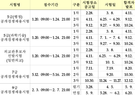 5급 공채 시험은 3월에, 7급 시험은 7월에 있으며, 특히 7급의 경우 2차 시험도 9월에 예정되어 있습니다. 이러한 일정들은 공무원 시험 준비를 하는 수험생들에게 매우 중요한 정보입니다.