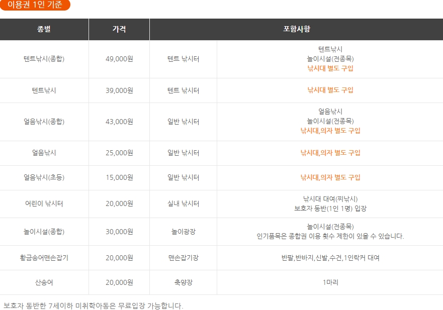 - 성인 15,000원 초중고 10,000원 36개월~7세미만(미취학) 7,000원