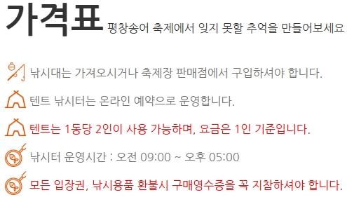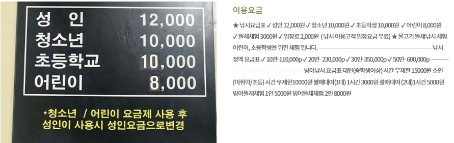 - 송어낚시 : 대인 20.000원 / 6세이하 무료, 빙어낚시 : 대인 20,000원 / 6세이하 무료