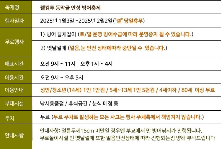 2025 얼음낚시 축제는 겨울철의 매력을 만끽할 수 있는 최고의 기회입니다. 사랑하는 사람들과 함께 따뜻한 추억을 만들어보세요!