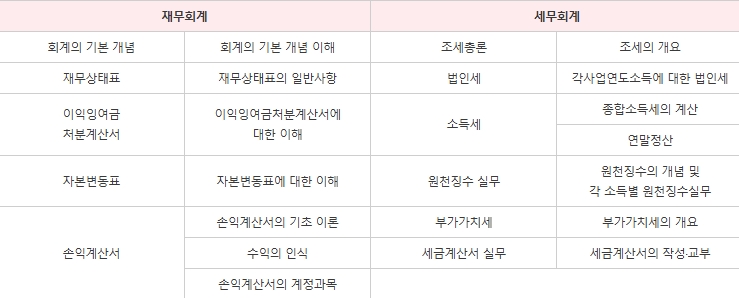 세부과목: 재무회계, 세무회계 과목별 40문항 (객관식 4지선다형)