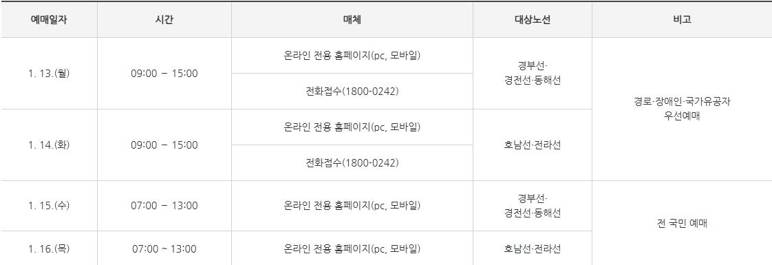 - 1월 13일(월) - 14일(화) : 경로 장애인 국가유공자 우선예매