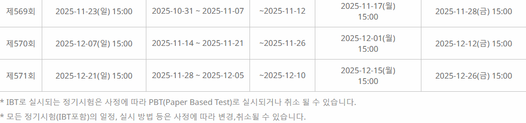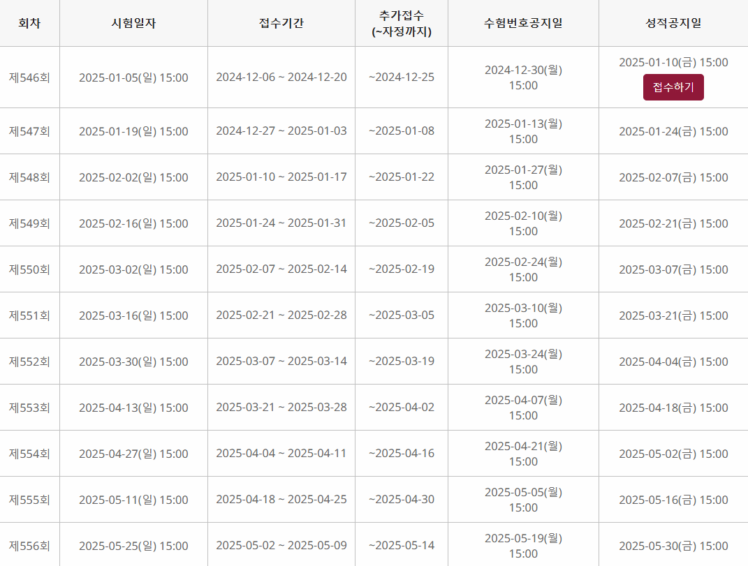 2025년도 G-TELP 정기 시험은 총 26회가 시행될 예정입니다. 첫 번째 시험인 제546회는 2025년 1월 5일에 실시됩니다. 아래 표는 각 회차별 시험일자 및 접수 기간을 정리한 것입니다.