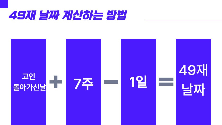 49재의 날짜를 계산하는 방법은 간단합니다. 고인이 돌아가신 날을 포함하여 7주 후의 날짜에서 하루를 빼면 됩니다. 예를 들어, 고인이 1월 1일에 돌아가셨다면, 7주 후인 2월 19일에서 하루를 빼면 2월 18일이 49재가 되는 것입니다. 이 계산법은 많은 사람들이 혼동하는 부분이므로, 정확히 이해하고 있어야 합니다.